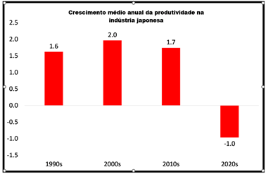 Quem está trabalhando está sobrecarregado. O Japão inventou o termo karoshi — morte por excesso de trabalho — há 50 anos, após uma série de tragédias entre os trabalhadores empregados. As grandes corporações estão promovendo a ideia de uma semana de quatro dias para aliviar essa pressão e aumentar a produtividade. Mas há poucos sinais de que esta ou qualquer outra medida esteja funcionando para aumentar a produtividade. O crescimento da produtividade negativo como mostra a figura em sequência.