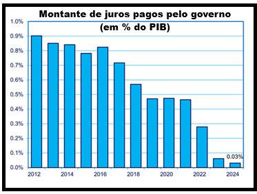 Sim, os rendimentos dos títulos subiram, mas a redução da dívida líquida e as taxas de juros ultrabaixas anteriores reduziram os pagamentos líquidos de juros em todos os níveis de governo para apenas 0,03% do PIB em 2024, em relação a quase 1% em 2012). Isso é facilmente administrável.