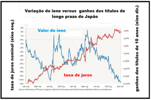 Figura: Algo errado? A taxa de juros no Japão subiu sem parar nos últimos dois anos, diferentemente do resto do mundo; contudo, a moeda manteve tendência a se depreciar, ao mesmo em termos nominais.