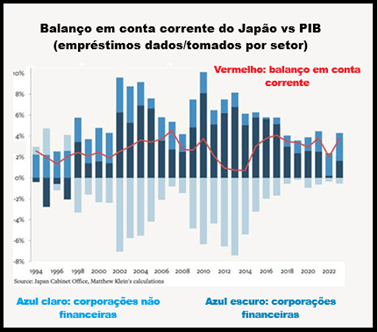 Figura: O balanço em conta corrente do Japão deve ser atribuído inteiramente às empresas que não desejam investir ou distribuir os lucros, os quais tem sido crescentemente obtido de juros vindos do exterior.