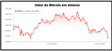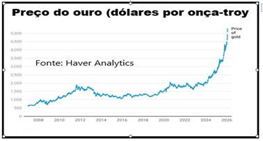 Além disso, as criptomoedas deveriam se beneficiar de vários riscos macro e geopolíticos, tais como o aumento da dívida e déficits dos EUA e de outras economias avançadas; a desvalorização do dólar e de outras moedas fiduciárias; novas guerras comerciais; e o aumento das tensões entre EUA e Irã, China e muitos outros. Contudo, o ambiente de risco elevado ajudou a explicar por que o ouro subiu mais de 60%, em 2025, como mostra o gráfico acima.