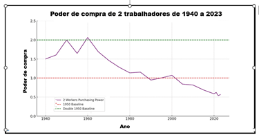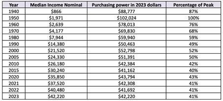 Para poder comprar hoje o essencial que os avós realmente podiam comprar em 1950, a renda mediana de 2023, de $42.220, precisaria ser de $102.024. Lembre-se: esta é uma pessoa, não uma casa ou uma família.