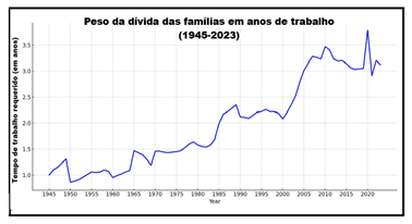Em 1950, a dívida das famílias era de 47 bilhões de dólares. Hoje, ultrapassa US$ 17,1 trilhões. Quando medido em anos de trabalho com salários medianos, o peso da dívida cresceu de oito semanas de trabalho em 1950 para 63 semanas hoje. Um aumento de 670%.