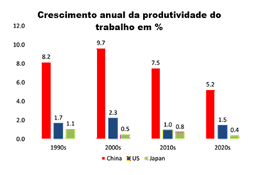 Note-se agora que o crescimento da produtividade é fundamental numa economia em que a população em idade ativa está diminuindo. Ele caiu de alturas antes impressionantes, mas ainda permanece significativamente mais alto do que nas economias capitalistas avançadas.