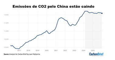 O desenvolvimento verde ainda é importante. As emissões de dióxido de carbono (CO2) da China caíram 1% no último trimestre de 2025, provavelmente garantindo uma queda de 0,3% para o ano inteiro. Isso estende uma tendência de “estabilização ou queda total” nas emissões de CO2 da China que começou em março de 2024 e já dura quase dois anos.