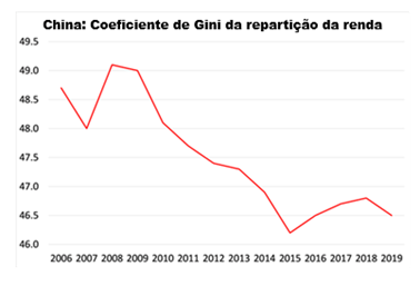 E a China apresenta um alto nível de desigualdade de renda pelos padrões internacionais, embora ainda seja menor do que muitas outras economias ‘emergentes’ como Brasil, México ou África do Sul – e a taxa de desigualdade medida pelo Índice de Gini atingiu o pico pouco antes da Grande Recessão e vem caindo desde então. A principal razão para a alta taxa de desigualdade é a disparidade de renda entre trabalhadores urbanos e rurais e entre os salários nas cidades costeiras e interiores, bem como as qualificações educacionais.