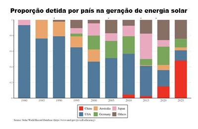 A indústria solar chinesa tem sido um exemplo emblemático do crescimento econômico do país nas últimas quatro décadas. A produção de energia solar chinesa cresceu 76% ao ano entre 2004 e 2013. Ao mesmo tempo, o custo da energia solar caiu mais de 90%, tornando-a competitiva em relação aos combustíveis fósseis.