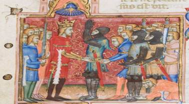 Investidura de um cavaleiro (miniatura dos estatutos da Ordem do Nó, fundada em 1352 por Luís I de Nápoles) – imagem de domínio público